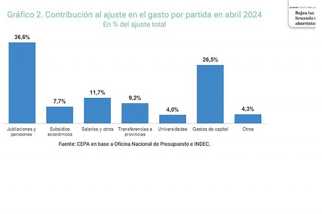 Así las cosas el superávit fiscal que se registró se explica en una fuerte contracción del gasto. Según el Centro de Economía Política Argentina (CEPA), “todas las partidas del gasto disminuyeron” aunque, destacan, “el componente principal es la reducción de las jubilaciones y las obras de infraestructura que explican el 37% y el 27% del total del ajuste”, respectivamente.