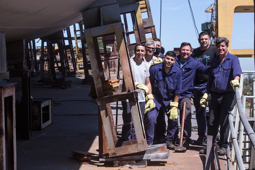 “Los primeros combatieron el golpe gorila, en la dictadura fuimos la empresa estatal con más desaparecidos; después sufrimos el vaciamiento menemista y las miserias del macrismo. Nosotros tomamos la posta, esa herencia de lucha. Tenemos que estar siempre a la altura”, reflexiona Villarreal, laburante con casi 20 años en el gremio. Lleva al astillero en la sangre por línea paterna. De su viejo Felipe, jubilado del taller de cobrería, aprendió el oficio de fabricar barcos desde cero. El morocho mira las gradas, esos planos inclinados que son el útero donde crecen las embarcaciones.