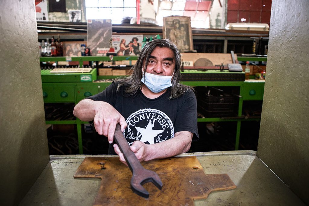 Custodiado por posters de San Cayetano y del Negro Olmedo, entrega mazas, llaves, tortuguitas para oxicorte. Al detalle, anota cada préstamo en un cuadernito. Advierte que tiene pocas pulgas, levanta temperatura si las herramientas no vuelven en tiempo y forma: “Tengo 18 años en la empresa, las pasé todas. Estuve en la permanencia en 2018. Verlo vivo de nuevo te llena de energía”.