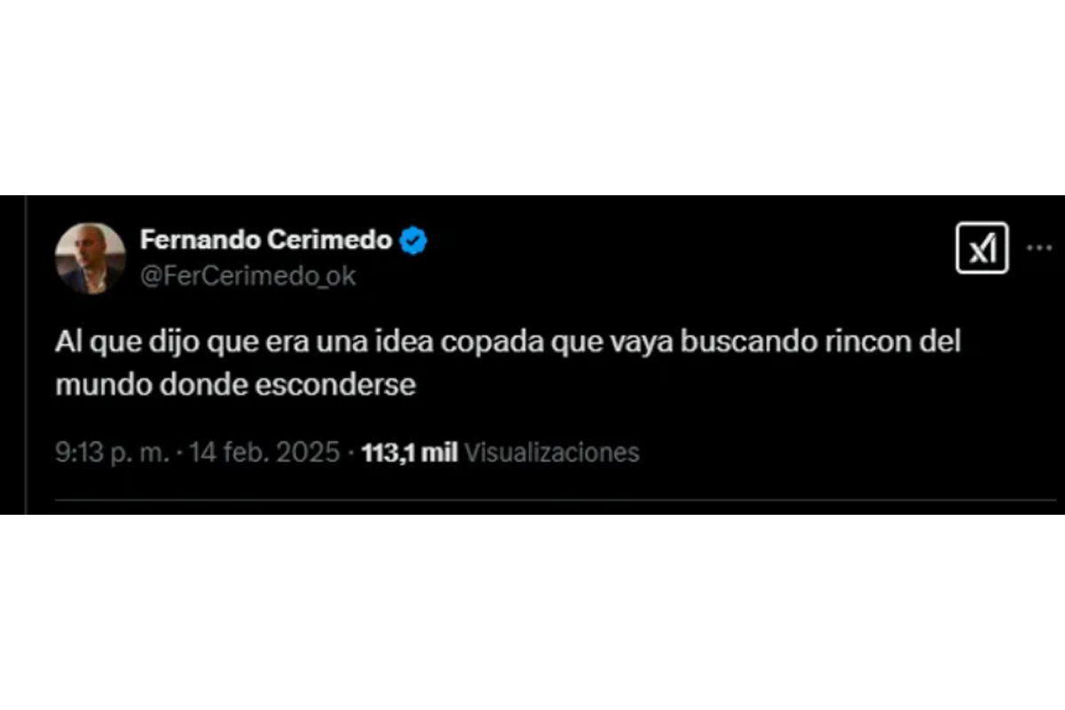 La polémica escaló aún más cuando Fernando Cerimedo, responsable de la estrategia digital de Milei, publicó un misterioso tuit: “Al que dijo que era una idea copada que vaya buscando rincón del mundo donde esconderse”.