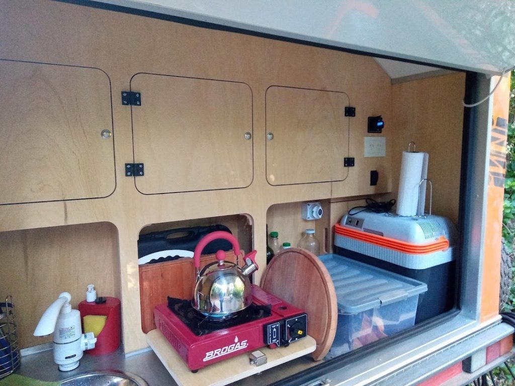 Es un tráiler con casa rodante, donde la parte trasera se abre y es allí donde está la cocinita, un anafe, con garrafa, bacha con agua para lavar, pequeña alacena y vajilla y hasta un mini mini refrigerador, todo se alimenta con una batería que se carga en el camping que hace de base.
