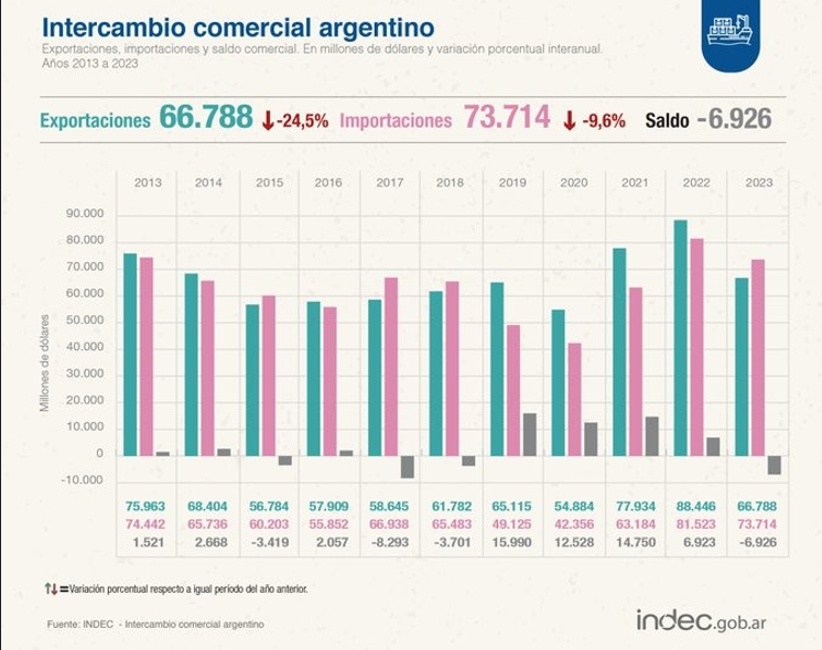 El intercambio comercial de la Argentina con el mundo cerró el año 2023 con un déficit de U$S 6926 millones, indicó el Indec este jueves. En 2022, el organismo registró un superávit por una cifra prácticamente igual, pero de signo positivo: U$S 6923 millones.