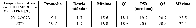 Comparando los estadísticos mensuales principales de este mes de diciembre de 2023 con los calculados a partir del registro completo de la serie EOC (2013 al presente) «se destaca la disminución del máximo y del desvío estándar; y el aumento de las demás medidas, en especial el del mínimo con un apartamiento de más de 1°C». El promedio de 19,7°C es 0,6 más alto que el promedio de la década.