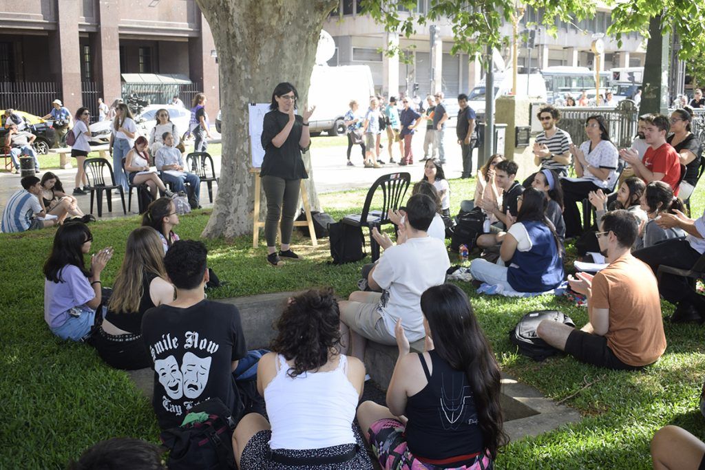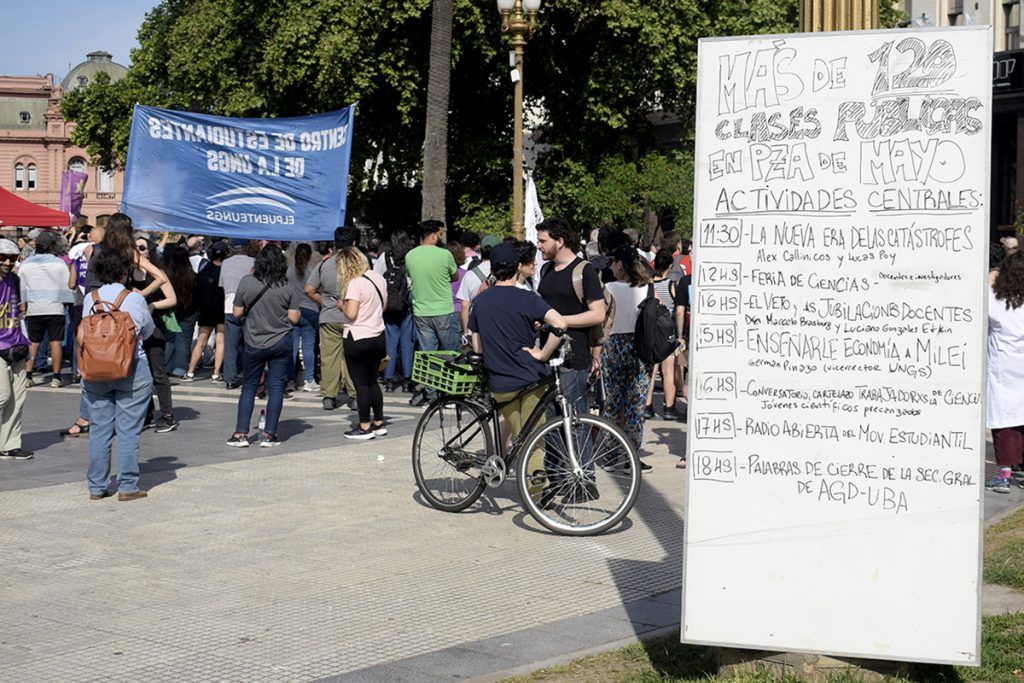 La universidad de la calle da cátedra en la Plaza de Mayo. Bajo este sol tremendo del martes, aula a cielo abierto de primavera, ágora del conocimiento en teoría y práctica de la resistencia popular. Lección magistral de docentes y estudiantes en lucha frente al oscurantismo y el sablazo presupuestario libertario.