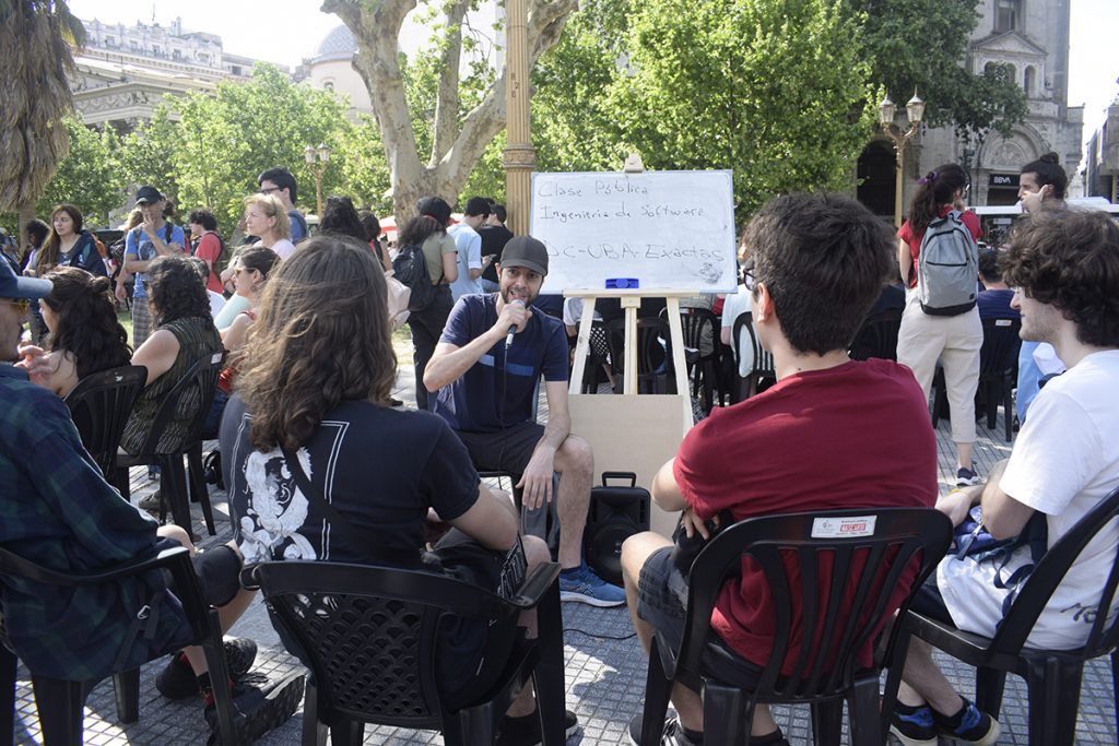 “Argentum virtus robur et studium, es el lema en latín de la UBA, mi amigo, la virtud argentina es la fuerza y el estudio. De ahí venimos, acá hay saberes, conocimientos, pensamiento crítico, esfuerzo y una historia de defender la educación pública. No nos han vencido ni lo harán”, dice bajo la sombra flaca de un plátano Cristian Antiba, profe de Electrónica experimental. El docente tiene aires dignos de Arquímedes. Se arrimó desde Rosario para sumar sus saberes a las 100 clases públicas que florecen frente a la Casa Rosada enrejada. Los escuchan atentos sus discípulos, Federico y Lucas, avanzados estudiantes de Física. Los pibes saben que dios no juega a los dados, la respuesta para defender a la universidad debe ser colectiva. A coro expresan su hipótesis: “Es ideológico el ataque de Milei, pero sobre todo económico. Hay interesados que se afilan los dientes para morder y arancelar. No les conviene la universidad pública, porque te enseña a pensar, a ayudar al otro, a progresar. Ellos sólo la ven como un negocio”.