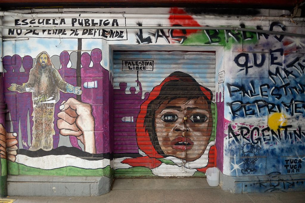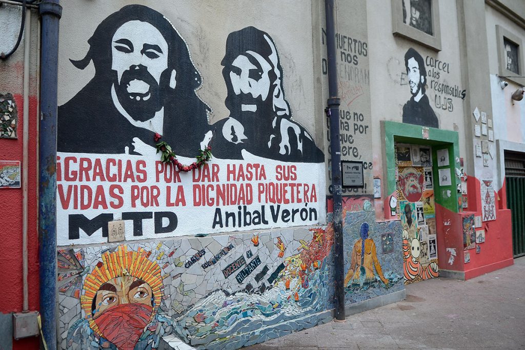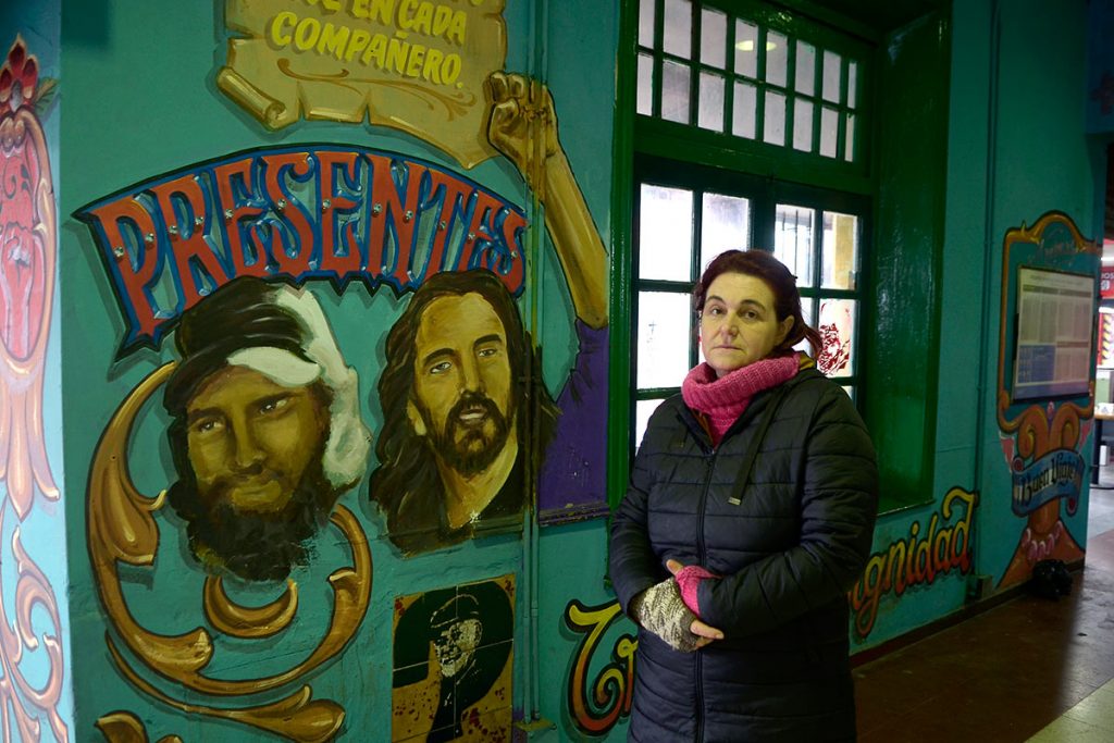 Las paredes de la estación son un patchwork. Retazos de batallas populares narran cada milímetro de sus paredes. La lucha piquetera hecha mural se da la mano con los feminismos, con los pueblos originarios, con la clase trabajadora, con el guardapolvo de Carlos Fuentealba, con la bicicleta del Pocho Lepratti, con Tehuel y Jorge Julio López que siguen sin aparecer, con una cholita marina que reclama mar soberano para Bolivia, con la sonrisa iluminada de Mariano Ferreyra, con la dignidad de los nadies.