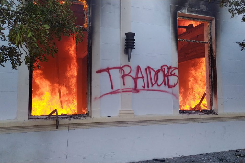 Dotaciones de Bomberos intentaban controlar el incendio en los edificios públicos. Su intervención se demoró porque, según informan medios de Chubut, los voluntarios no tenían las garantías para poder trabajar en medio del violento enfrentamiento entre la Policía y los manifestantes.