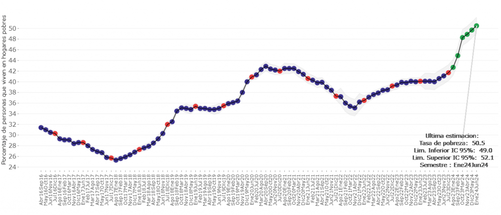 En el primer trimestre de 2024 la pobreza se estimó, para el total urbano, en 54.9% y la indigencia en 20.3%.
