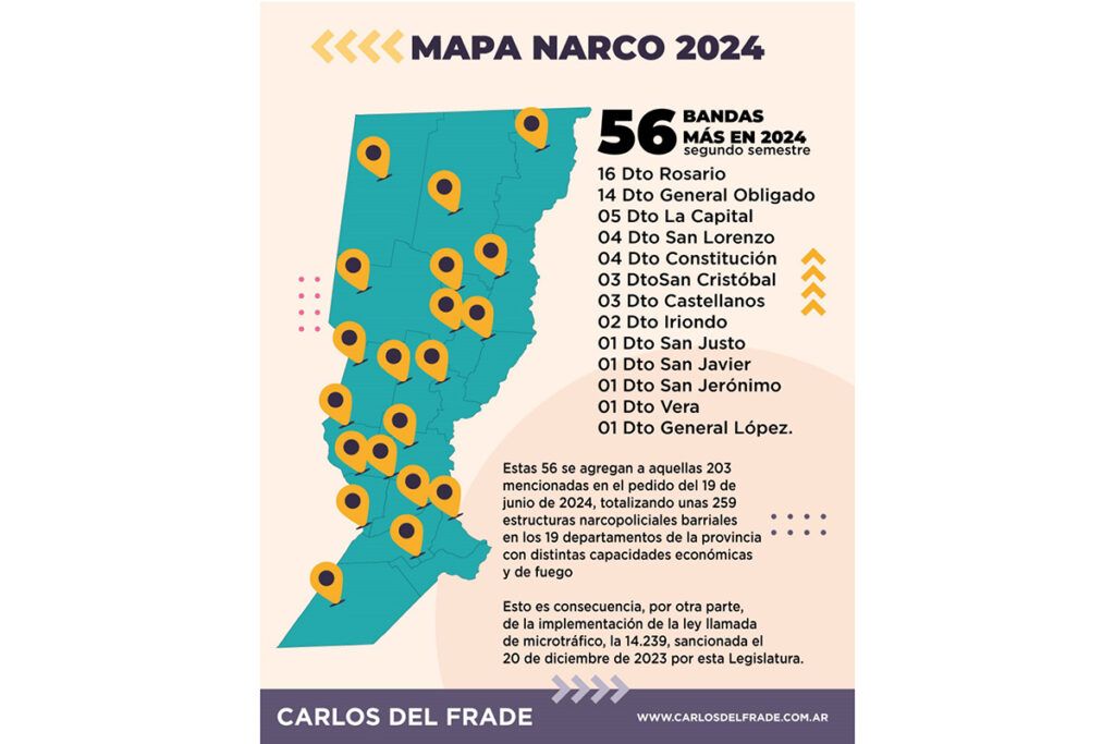 El diputado provincial por el Frente Amplio por la Soberanía, Carlos del Frade, presentó en junio en la Legislatura local la actualización del “Mapa Narco de Santa Fe” donde se precisaba que convivían unas 203 bandas narcopoliciales en los 19 departamentos. “A fines de 2024 y a casi seis meses de aquel pedido de informes hemos constatado la existencia de otras 56 bandas”, resume.