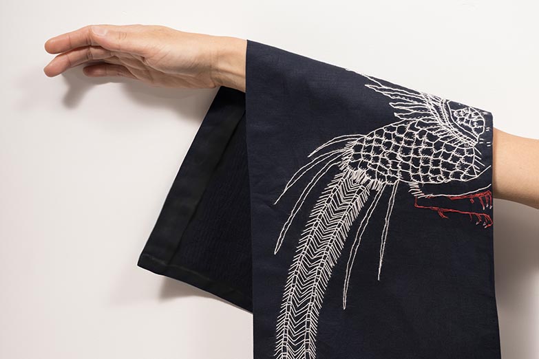 La artista responde: “Existe una máquina que reproduce la puntada del sashiko, pero ahí hay algo para pensar que es más complejo porque las artesanías, los crafts japoneses implican un tema ético relacionado con el valor que tiene hacer algo a mano y un principio estético que tiene que ver con la imperfección. Lo que está hecho a mano muestra el alma de quien lo hace. En la asimetría natural, en la imperfección que tiene una pieza hecha a mano hay una belleza particular. Pensado desde el movimiento Minguei (que valora lo hecho por artesanos anónimos que no buscan exaltar su ego ni enriquecerse), lo que se hace a mano como este arte de las puntadas es una respuesta a la industrialización. Es interesante pensarlo desde este punto de vista, considerar el valor que tiene una antigua tradición artística en un mundo que se modernizó.”