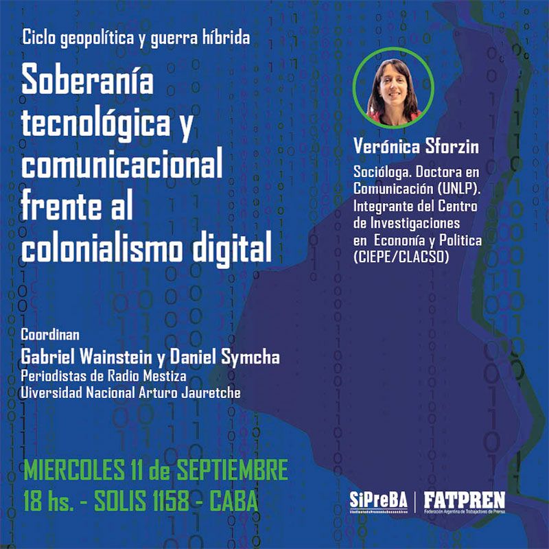 Este miércoles prosiguen las charlas del ciclo “Geopolítica y Guerra Híbrida” que se realizan en la sede de SiPreBA/FATPREN en la ciudad de Buenos Aires. En esta ocasión el tema es “Soberanía tecnológica y comunicacional frente al colonialismo digital”, y se abordarán cuestiones relacionadas con extractivismo de datos, inteligencia artificial, redes, nuevas subjetividades y fragmentación social.