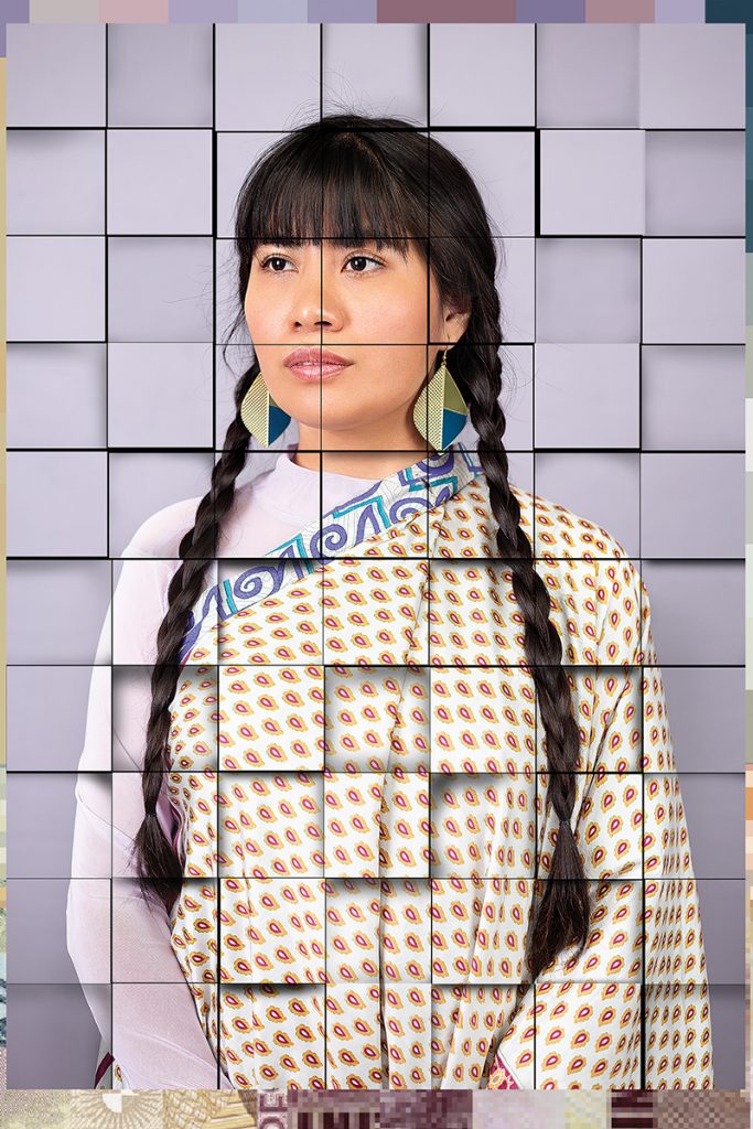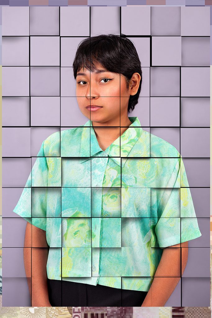 También explicó: “Utilizo la investigación histórica para contextualizar un hoy y proponer un futuro que repiense los espacios que ocupamos. Utilizo el retrato fragmentado con tonalidades inspiradas en el cerro de los siete colores y la imagen pixelada de los billetes argentinos para expresar la compleja relación entre la deconstrucción colectiva, el pensamiento colonial, la clase y la condición racial”.