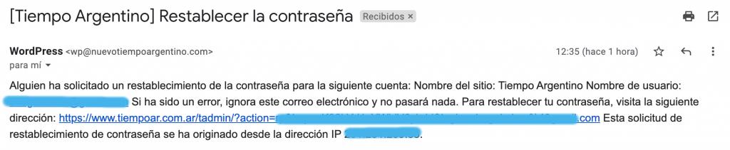 4. Buscar un correo de [email protected] con el asunto similar a este [Tiempo Argentino] Restablecer la contraseña