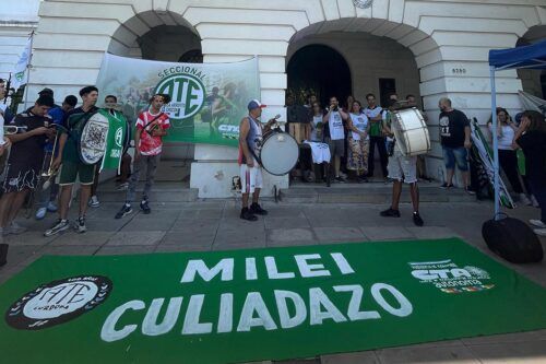 Con una bandera extendida con la consigna “Milei culiadazo” sobre la explanada de la sede central de la Comisión Nacional de Energía Atómica (CNEA), en Av. del Libertador 8250, en Ciudad de Buenos Aires, se realizó este martes una jornada de protesta de trabajadores por las medidas del gobierno nacional que afectan al sector.