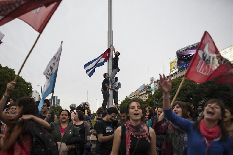 No faltaban las pancartas improvisadas a mano. Algunas hechas de cartón, como una que se repetía a lo largo y ancho de la concentración: decía simplemente Fidel vive. También se vieron banderas cubanas atadas a los cuellos de los manifestantes, como si fuera el simpático uniforme de un boy scout o, mejor dicho, de un pionero cubano (niños que cursan el jardín de infantes y que pronuncian el famoso juramento: Seremos como el Che). Entre las personalidades presentes se escuchaban reflexiones sobre el rol histórico que tuvo Fidel Castro, tanto desde la consolidación de la Revolución Cubana tras el fracaso de la invasión a Bahía de Cochinos como también durante la ola de gobiernos neoliberales que azotó a América Latina en la década de los 90.