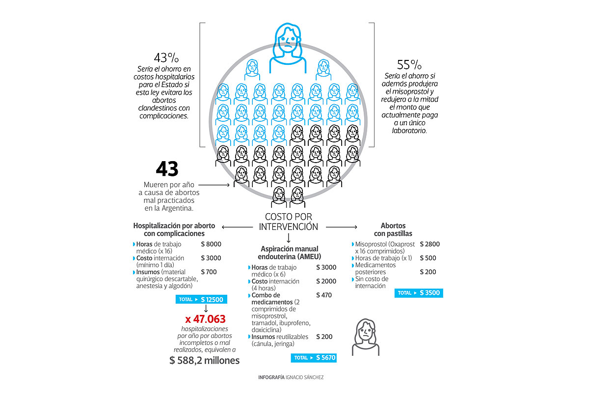 Al sumar los abortos que ya se practican y que por complicaciones terminan en el sistema de salud público, más los abortos no punibles tratados con distintos métodos, se estima que la práctica demanda como mínimo un total de 1077 millones de pesos, de los cuales un 79% corresponden a los costos de abortos clandestinos que requirieron internaciones en hospitales públicos.