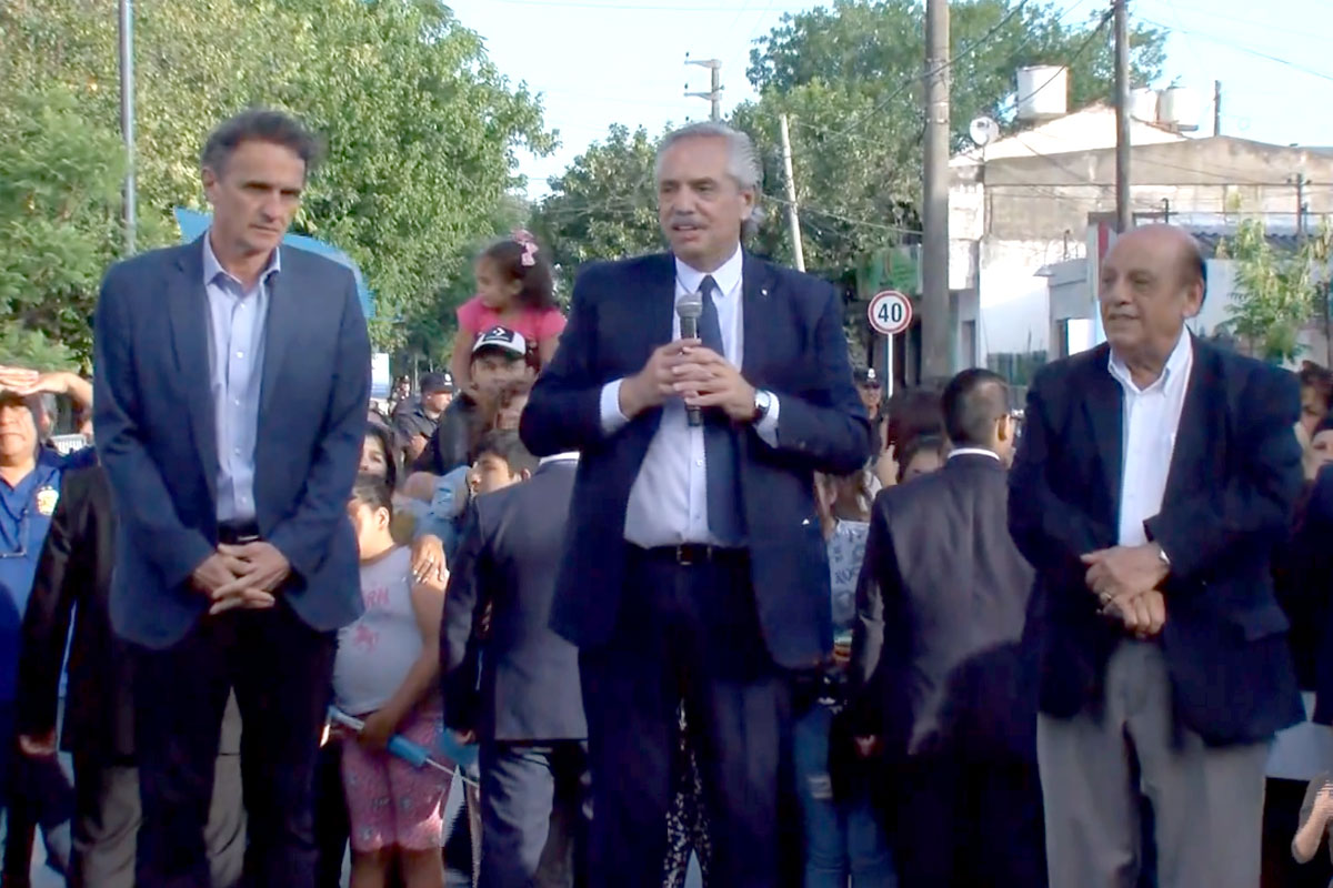 Fernández encabezó un acto de inauguración de pavimentación en la localidad de Berazategui, en la zona sur del conurbano bonaerense, durante un acto que contó con la presencia del ministro de Obras Públicas, Gabriel Katopodis; y el intendente local, Juan José Mussi.