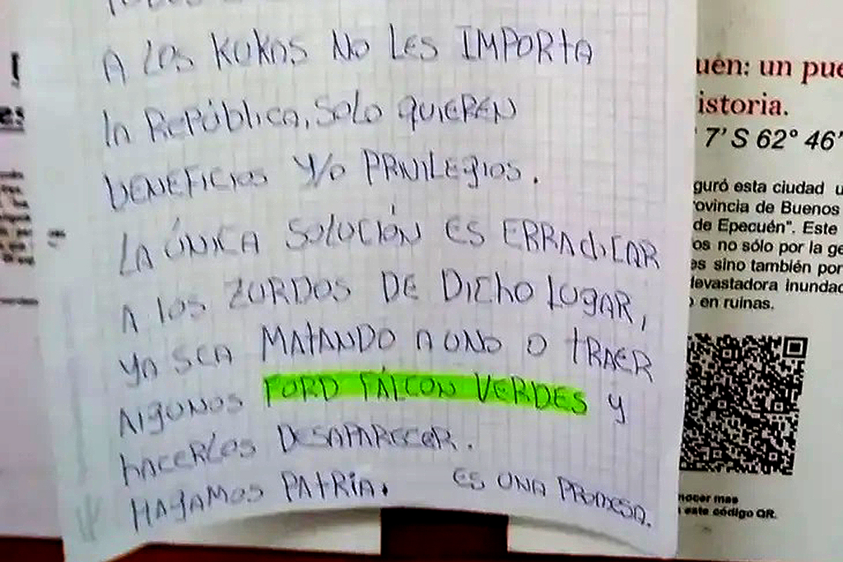 Trabajo en el Instituto 35 de Monte Grande desde 2007. Dicto la materia “Teoría de la Historia”. El lunes, en un pasillo, apareció pegada la hoja escrita a mano. Se dirigía a las y los ingresantes. Hablaba de «erradicar a los zurdos», de «traer algunos Ford Falcon verdes y hacerlos desaparecer».Publiqué ayer un tuit al respecto que, fuera de los trolls que inevitablemente aparecieron cuando el mensaje se hizo más o menos notorio, provocó lógica indignación y expresiones de solidaridad. Sin embargo, algunas personas junto a su repudio y su apoyo caracterizaron el hecho como la obra de un “loquito”, minimizándolo. Me parece importante detenerme en esto.