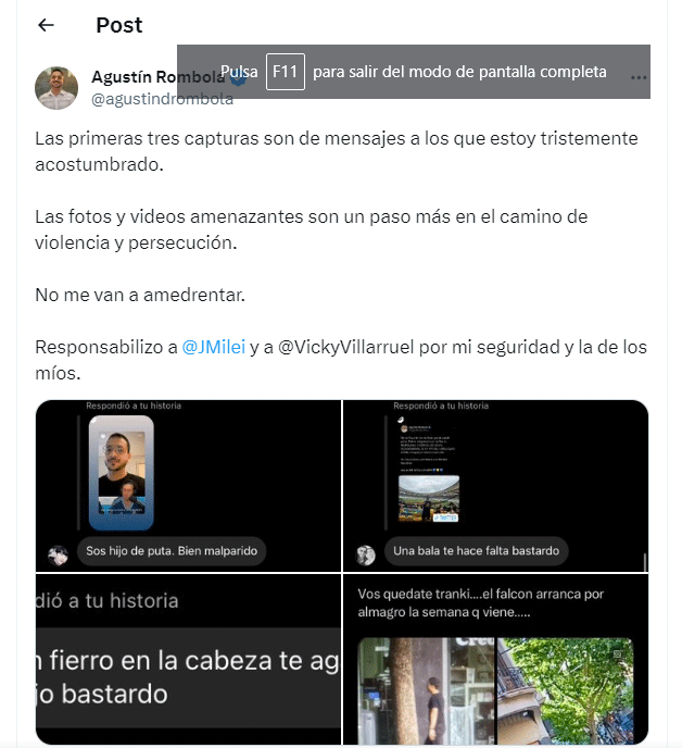 Rombolá reconoció que esta no es la primera vez que recibe amenazas virtuales a lo que está “tristemente acostumbrado”. Sin embargo, dada la delicadeza del caso, responsabilizó a Javier Milei y Victoria Villaruel por su integridad física y la de su círculo cercano después de que sus propios militantes lo fotografíen en los alrededores de su casa en el barrio porteño de Almagro.