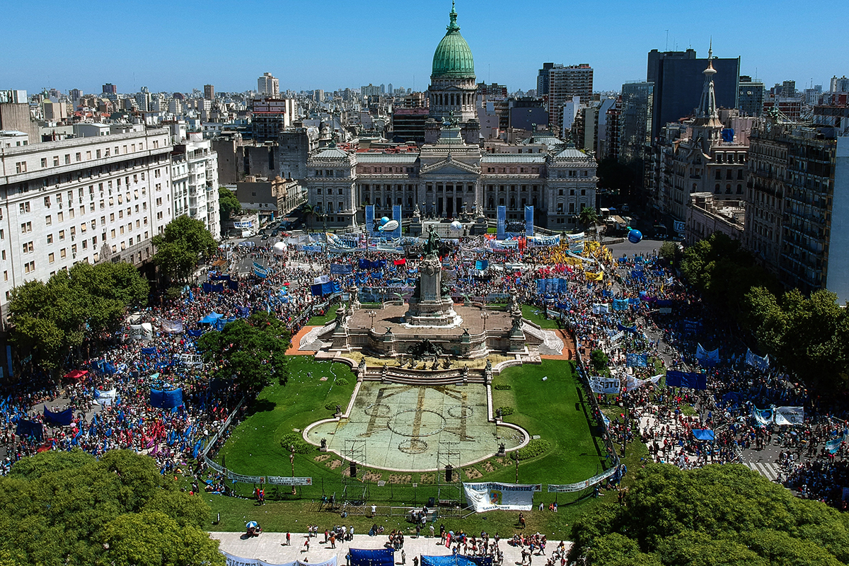 En la Plaza del Congreso están las organizaciones sociales, políticas y sindicales que acompañan al Frente de Todos. Su presencia se extiende por Rivadavia e Hipólito Yrigoyen hacia la Avenida 9 de Julio. A pocas cuadras de allí, sobre Corrientes los turistas pasean ajenos a la manifestación. El único indicio que allí interrumpe la parsimonia del feriado es una columna de Política Obrera rodeada de policías de la Ciudad de Buenos Aires en Corrientes y Callao.