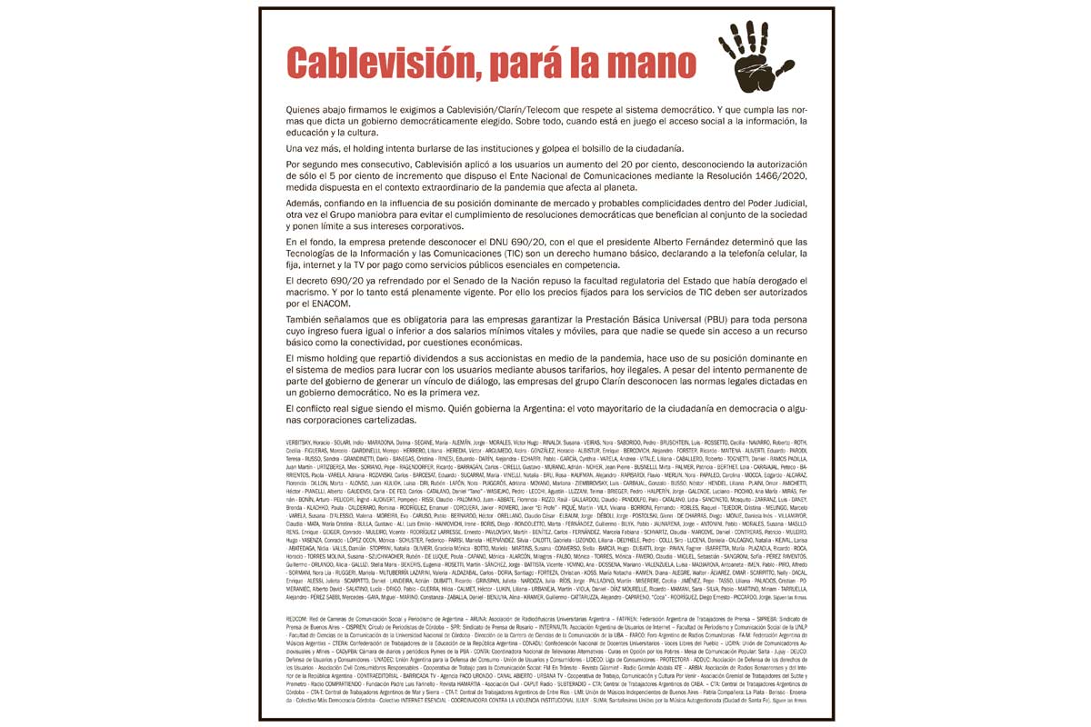 Quienes abajo firmamos le exigimos a Cablevisión/Clarín/Telecom que respete al sistema democrático. Y que cumpla las normas que dicta un gobierno democráticamente elegido. Sobre todo, cuando está en juego el acceso social a la información, la educación y la cultura.