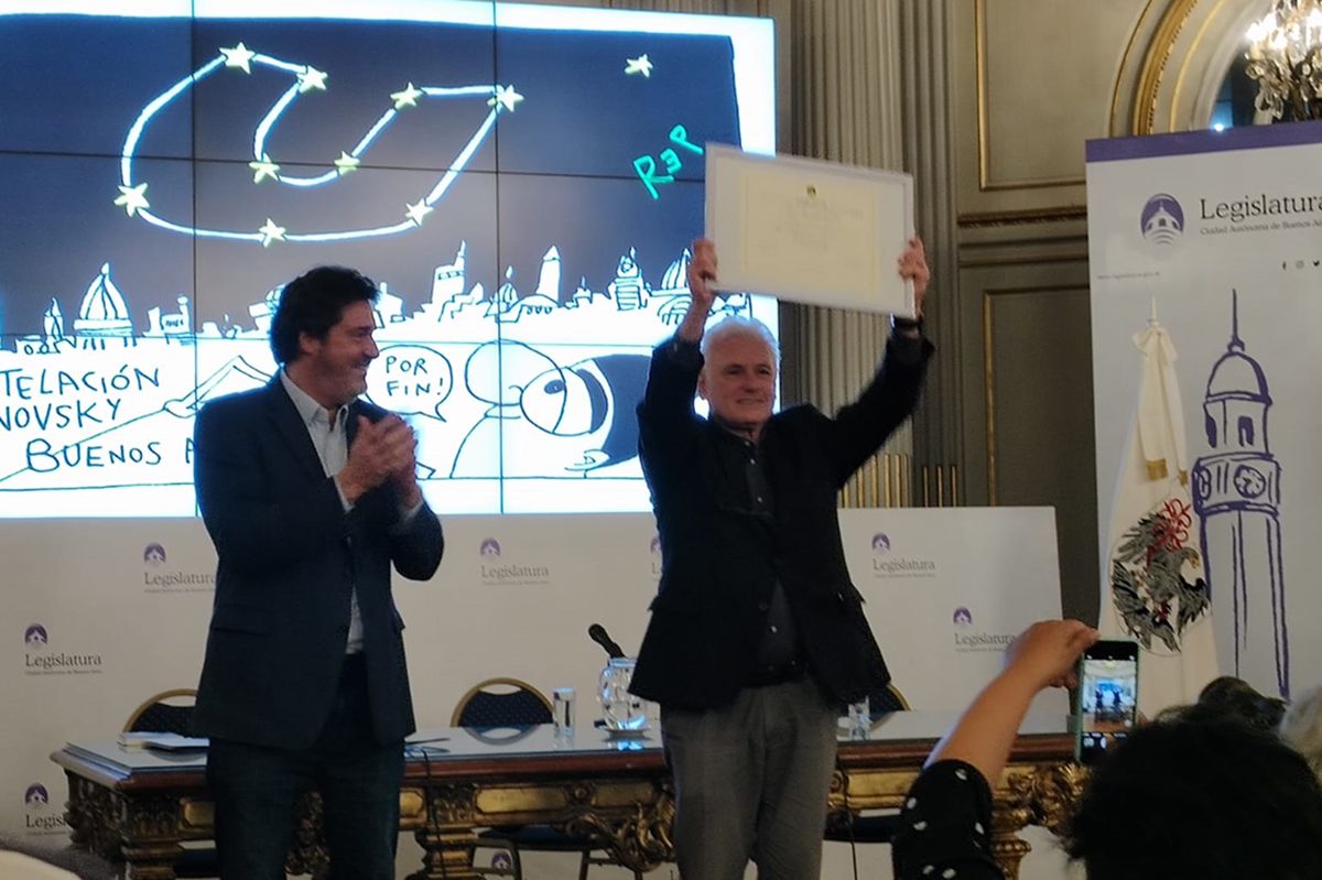 Lo acompañaba el diputado Matías Barroetaveña (Unión por la Patria), quien pergeñó la resolución N° 791 (que fuera votada por unanimidad en el recinto) que declaró “Personalidad Destacada en la Ciudad Autónoma de Buenos Aires en el ámbito de la Cultura a Carlos Ulanovsky”. En la misma presentación, a la vez, se dio cumplimiento a la resolución N° 735 del propio legislador, que declara de “interés cultural” el libro Querido Ula, 80 cartas de amor, que fuera compilado por Humphrey Inzillo y Martín Giménez, publicado por Editorial Orsai y que se constituyera en un extraordinario regalo sorpresa para Ula, cuando el pasado 23 de octubre cumpliera los 80.