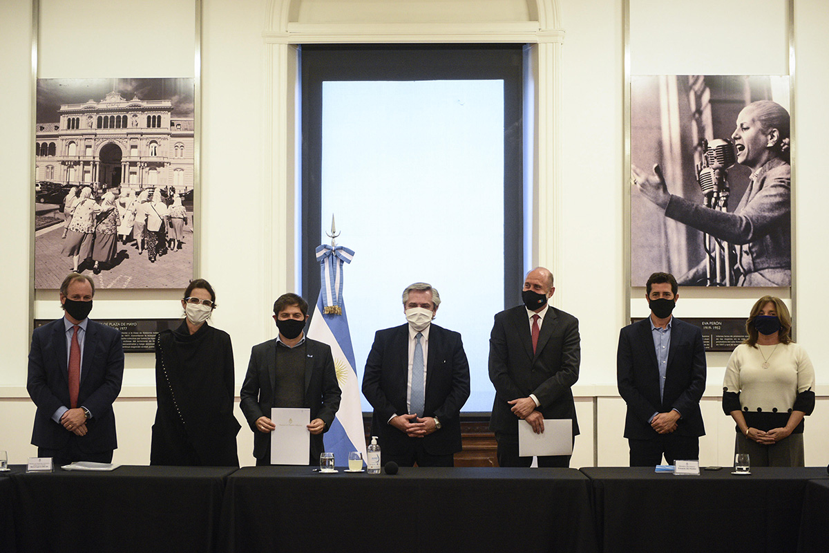 El presidente Alberto Fernández recibió a los gobernadores de las provincias de Buenos Aires, Santa Fe y Entre Ríos que adhirieron al plan Argentina Construye, Axel Kicillof, Omar Perotti, y Gustavo Bordet. De la firma de los acuerdos participaron el ministro del Interior, Eduardo de Pedro; la ministra de Desarrollo Territorial y Hábitat, María Eugenia Bielsa. Convenios similares ya habían sido suscritos por las provincias de Misiones y Formosa.