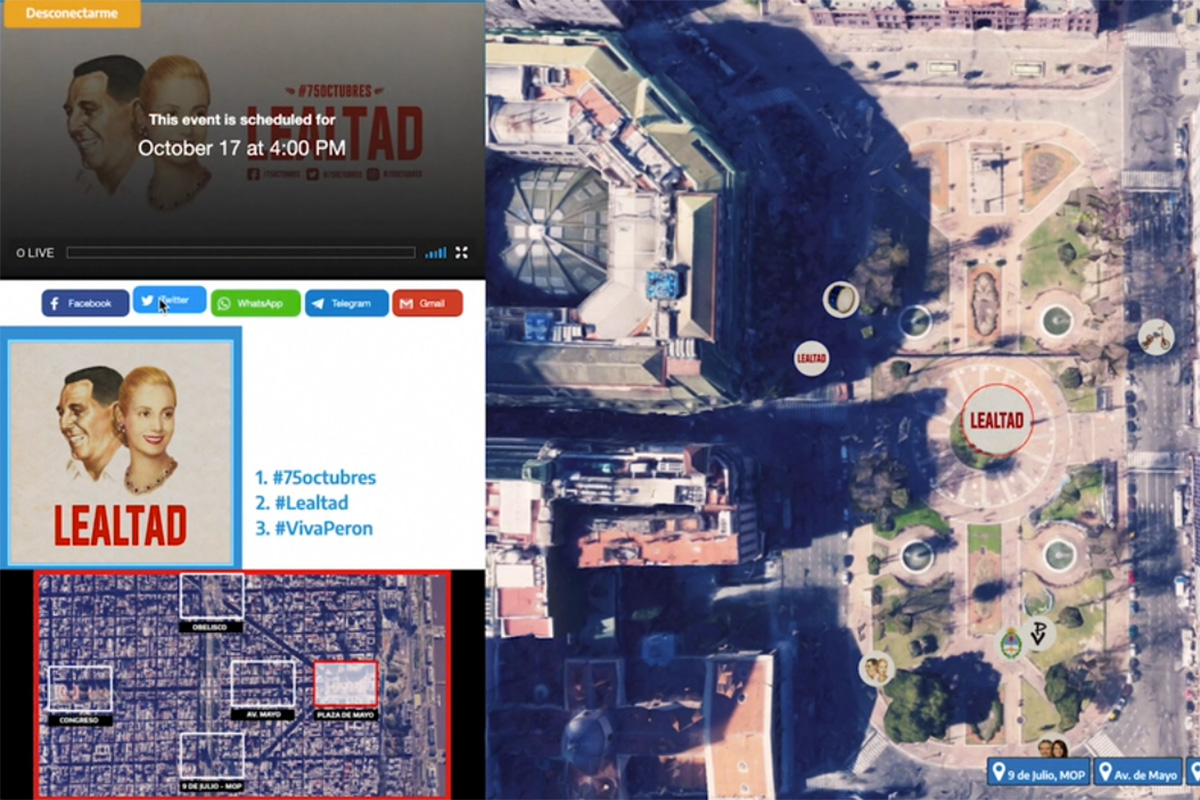 La movilización virtual prevista para esta jornada comenzará a las 13, cuando se podrá ingresar al sitio 75octubres.ar, elegir un ‘avatar’ de Perón, Eva Perón, Cristina Kirchner o Néstor Kirchner para que los represente mientras ocupa un lugar en el plano que geolocaliza la movilización como si fuera la Plaza de Mayo.