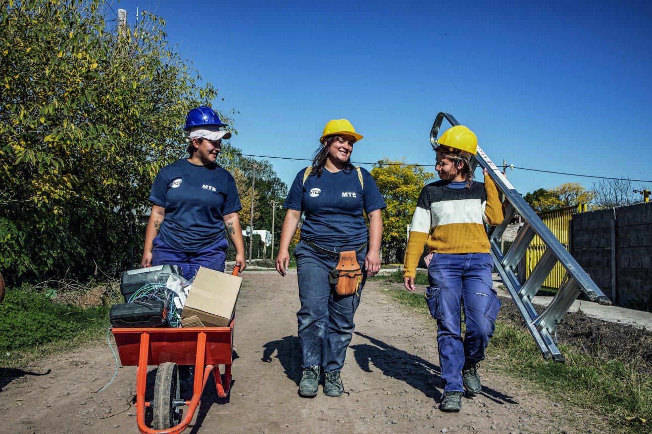 “Comenzamos con cuadrillas mixtas en un mejoramiento de 25 viviendas que se realizó en el barrio Nuevo Progreso, en Córdoba Capital. En ese momento eran solo cinco compañeras mujeres. Luego, en La 12 se desarrolló un proyecto de obras que permitió proveer de instalaciones seguras de luz a los vecinos. Ahí ya sí participaron muchas más, incorporadas en 4 o 5 cuadrillas: se sumaron a los equipos técnicos, administrativos, como responsables sociales, coordinadoras de obra o pañoleras. Un par de meses más tarde, la Lili, la Belén, la Eli, la Joana y otras tantas pibas, habían copado el rubro y se habían convertido en las responsables indiscutidas de las instalaciones eléctricas de la rama”, cuenta Débora, referente del MTE en Córdoba.