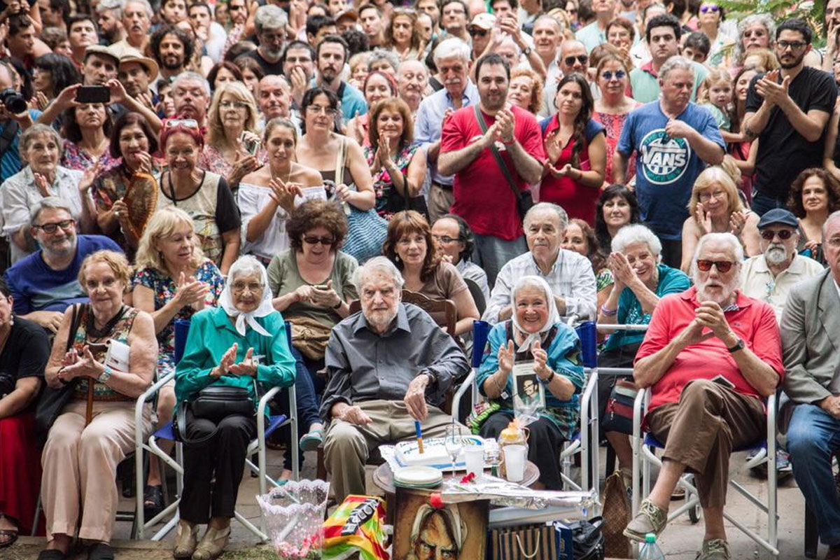 La plaza es la misma que eligió el escritor para festejar sus 90 años junto a Norita Cortiñas, Tati Almeida, organizado por el Sindicato de Prensa (Sipreba) del cual fue Secretario General Honorable, a mediados de febrero de 2017. El periodista, escritor, historiador y militante anarquista, y defensor de los derechos humanos vivió hasta sus últimos días en Belgrano luego de haber llegado de Santa Fe, en su casa bautizada por Osvaldo Soriano como «El tugurio».