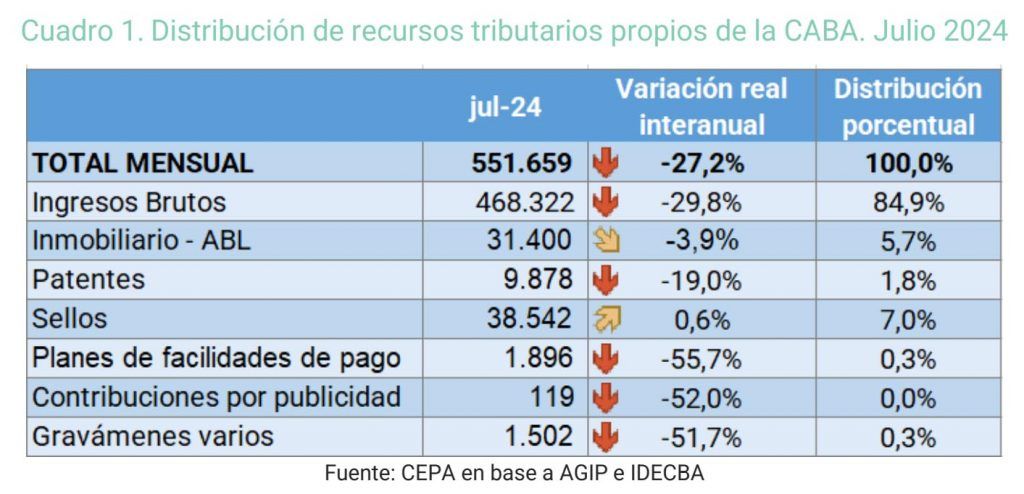Como destaca el informe del CEPA, Ingresos Brutos es por lejos la principal fuente de recursos de la Ciudad.El relevamiento asegura que se percibe un incremento real sostenido desde marzo 2023 hasta octubre de ese mismo año. Pero a partir de octubre de 2023, “Ingresos Brutos entra en un notable sendero de caída real de la recaudación. Entre octubre de 2023 y julio 2023 dicha caída es del 34% en términos reales”.