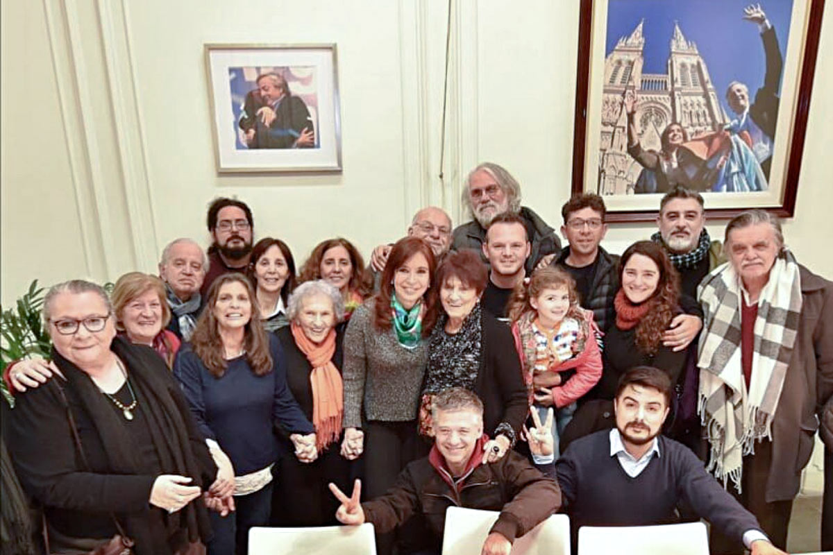 El jueves y el viernes, en paralelo a la acción del Poder Judicial, CFK mantuvo reuniones con organismos de Derechos Humanos, intelectuales, figuras de la cultura y del ambiente artístico. El primer encuentro, que duró más de una hora y estuvo cruzado por las demostraciones de afecto, ocurrió el jueves: Cristina recibió a Taty Almeida (Línea Fundadora), Lita Boitano (Familiares de Desaparecidos Detenidos por Razones Políticas), Carlos Pisoni (HIJOS), el jurista Eduardo Tavani y el sociólogo Horacio González, entre otros. Al día siguiente se difundió una solicitada firmada por Abuelas de Plaza de Mayo, Madres Línea Fundadora, Familiares, APDH, Liga por los Derechos del Hombre, HIJOS Capital, Movimiento Ecuménico por los Derechos Humanos, Familiares de los 12 de la Santa Cruz, entre otras entidades. El pronunciamiento manifestaba un “explícito apoyo” a Cristina y advertía sobre la persecución judicial, “que no respeta ni siquiera el resguardo de su intimidad o la presencia de sus abogados defensores”. “La realidad nos indigna y nos angustia pero a la vez nos exige estar a la altura del desafío de la resistencia”, concluían los organismos.