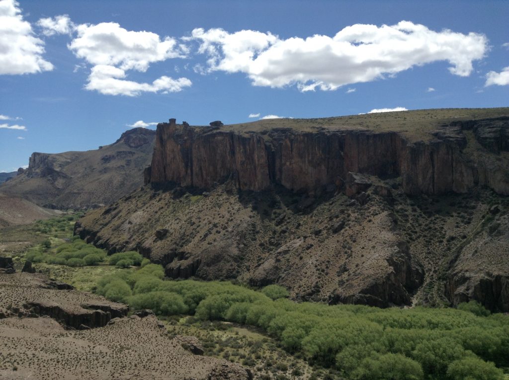 Sin ánimo de espolear, además de las famosas manos también hay escenas de caza pintadas sobre las paredes de los aleros que preserva la entraña de la montaña. Debajo, bien abajo, a su izquierda, verá un cordón verde que forman los sauces que abrazan al río Pinturas, y todo el cañadón que llega al horizonte. Hermoso.
