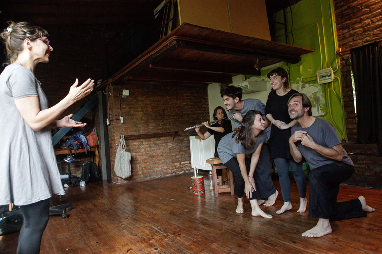 Sobre el piso de madera, tapando los espejos y ubicando los paños, la compañía de seis integrantes compuesta por actrices, actores, directora y música acuerda la planificación del lunes, previa al reestreno del ciclo. La música (Mariana Occhiuzzi) ubica en el piso flauta traversa, flauta doble, calimba, cajones y diversos instrumentos artesanales que animarán las escenas por venir; la directora (Verónica Klas) guía las pautas y ubica dos sillas al costado de la representación, una para dar asiento al narrador y la otra para ella y sus compañeros y compañeras. Las actrices (Elisa Davolio y Ángeles Camblong) como los actores (Rubén Carmona y Mariano Bottindari) estiran las primeras vértebras y exhalan los bostezos de la relajación. Occhiuzzi y Klas acuerdan al oído un precalentamiento de ojos tapados con telas para dar lugar a los ejercicios de improvisación con sonidos de aire y madera. La consigna posterior propone abrir el cuerpo, cuidarse y cuidar a los otros al caminar, decidir cada movimiento, buscando distintas velocidades y direcciones para que las manos cuenten.