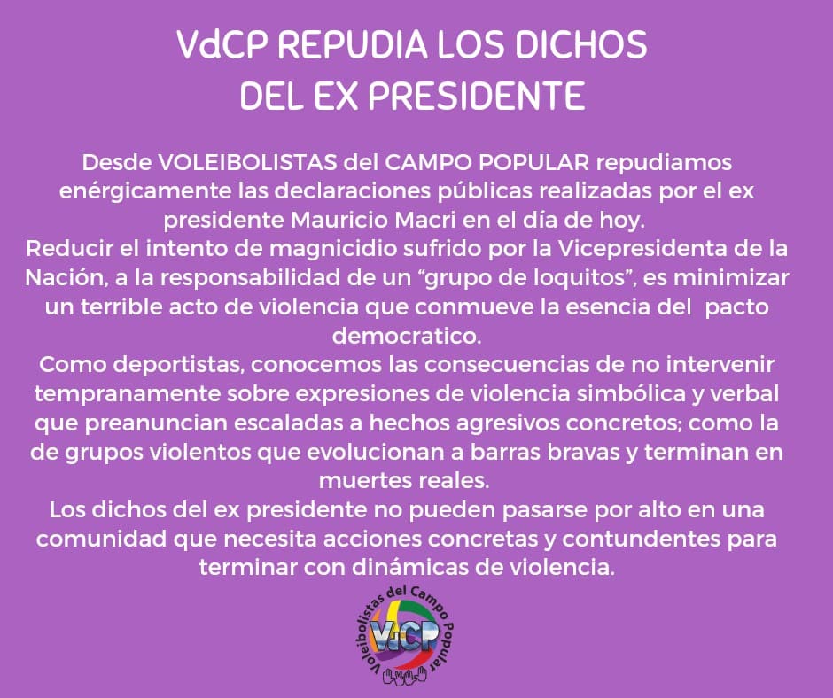 «Desde Voleibolistas del Campo Popular repudiamos enérgicamente las declaraciones públicas realizadas por el ex presidente Mauricio Macri. Reducir el intento de magnicidio sufrido por la vicepresidenta a la responsabilidad de ‘un grupo de loquitos’ es minimizar un terrible acto de violencia que conmueve la esencia del pacto democrático», expresó VdCP, una de cuyas voces más conocidas es la de Jon Uriarte, ganador de la medalla de bronce con la selección de voley en los Juegos Olímpicos Seúl 1988.