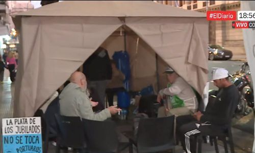Cómo no recordar a Norma Plá. Los y las jubilados cantan «¡Paro, paro, paro… paro general!» Hablan y debaten entre ellos, surgen ideas y se entusiasman. Al final, toman la decisión: «Hoy acampamos acá. Nos quedamos hasta mañana para hablar con los diputados».