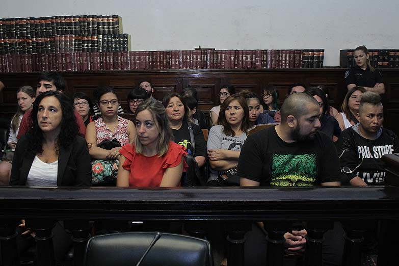 La sala era muy pequeña para un juicio como este, por su relevancia social y judicial. Muchas personas se quedaron afuera. David Marino fue de los primeros en ubicarse en el banquillo de los acusados, fuertemente custodiado por policías. Después se abrió la sala a lxs periodistas y luego a la familia.