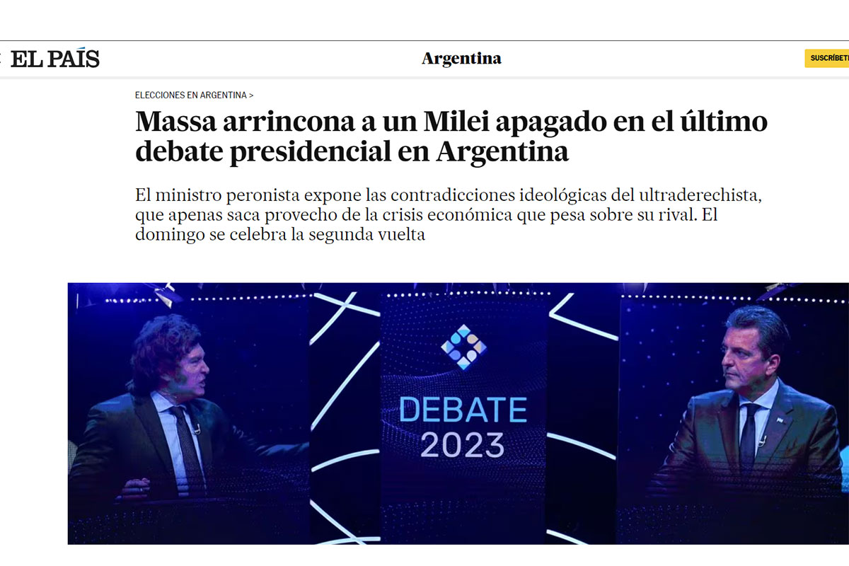 El diario español El País tituló: «Massa arrincona a un Milei apagado en el último debate presidencial en Argentina», y en el mismo sentido, El Mundo, también de España, consideró que «Massa domina psicológicamente a Milei en un debate presidencial de enorme audiencia en Argentina».