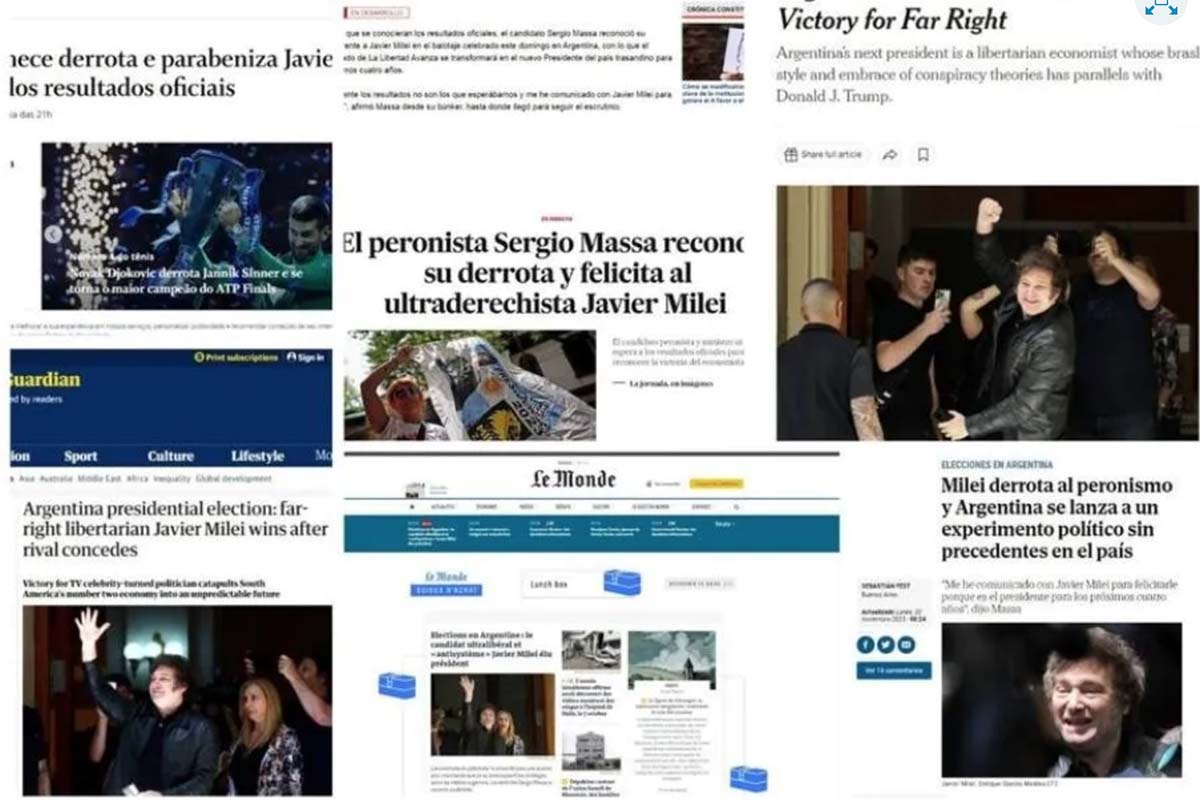 Distintos diarios del mundo reflejaron este lunes el triunfo del presidente electo de La Libertad Avanza, Javier Milei, en las elecciones generales de este domingo como un hecho «sorpresivo» y como «un vuelco histórico» en la historia política argentina. El diario El País de España titula en su portada «El ultra Milei arrasa y Argentina da un salto a lo desconocido», y agrega que el dirigente de la ultraderecha gana las elecciones al obtener el 56 por ciento de los votos frente al 44 del peronista Sergio Massa».