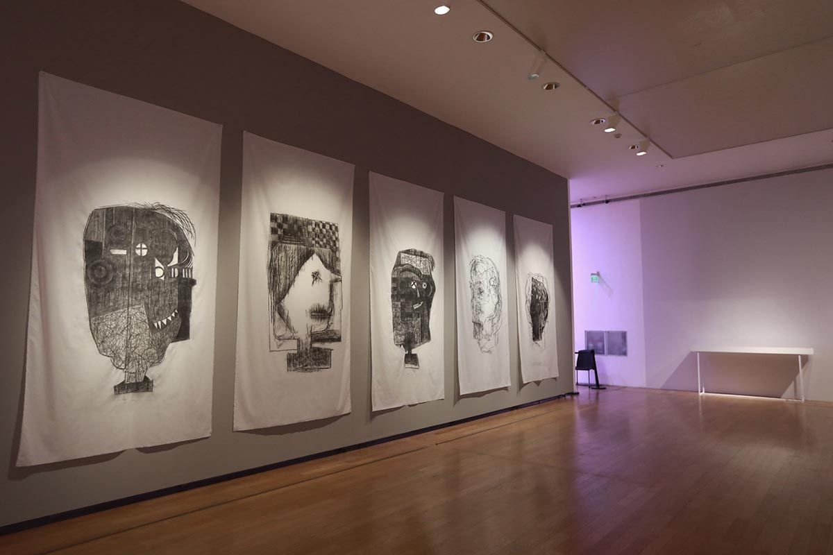 En los muros laterales, frente a la sala se disponen las piezas hechas en 2022 de “Todas las caras del rostro”: dibujados sobre diez sudarios, “estos rostros nos confrontan con sus cuencas vacías, mostrándonos con descaro sus dientes apretados, sus cráneos pelados o adornados con rizos, sus narices puntiagudas dispuestas sobre patrones de damero vistos en escorzo, combinando tramas que delatan la textura de la tela”, escribe Justo Pastor Mellado en el texto curatorial. Es una visión expresiva que conjura la faz política de los rostros.