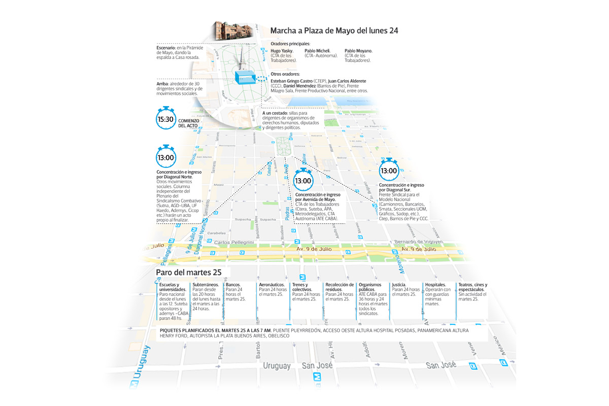 Desde las 13, las columnas se concentrarán en distintos puntos. En Avenida de Mayo y 9 de Julio lo harán los sindicatos de las CTA que ingresarán por el centro de la plaza. Por avenida Belgrano y Diagonal Sur ingresarán los gremios de la CGT agrupados en el Frente Sindical y el triunvirato de movimientos sociales compuesto por la CTEP, CCC y Barrios de Pie.