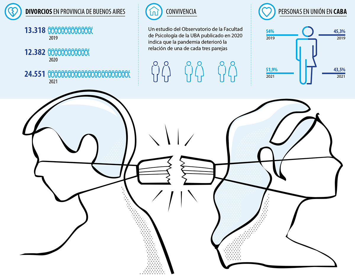 En una pandemia, los cimbronazos retumban en todos los aspectos. Las relaciones no son la excepción. Tras la cuarentena, la Provincia de Buenos Aires registró la tasa de divorcios más alta de su historia. Hasta 2020, la estadística permanecía estable pero con la salida del aislamiento se duplicaron de los casos: según el Registro bonaerense de las Personas, la cifra de 12.382 desvinculaciones inscriptas en 2020 pasó a 24.551 en 2021. En ese mismo período, la Ciudad de Buenos Aires tuvo por primera vez más separaciones conyugales que casamientos. ¿Qué produjo la pandemia para que se alcanzaran estos récords? ¿Qué vino a transparentar o destapar?