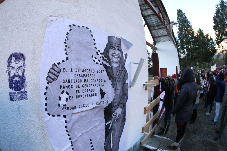 Los manifestantes portaron fotos y pancartas de Santiago Maldonado y no dejaron de cantar ¡con vida lo queremos!. El final de la marcha dejó como imagen elocuente la fachada del escuadrón de Gendarmería lleno de pintadas a modo de testimonio desesperado de reclamo y justicia.