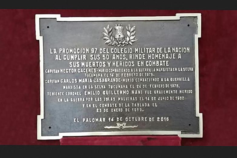 El último viernes 14 de octubre, el Colegio Militar descubrió una polémica plaqueta dentro de la institución. Por los 50 años del egreso del capitán Héctor Cáceres armaron un acto en las instalaciones de la escuela en el que reivindicaron a Cáceres por haber fallecido combatiendo a la guerrilla marxista en la selva tucumana el 14 de febrero de 1975.
