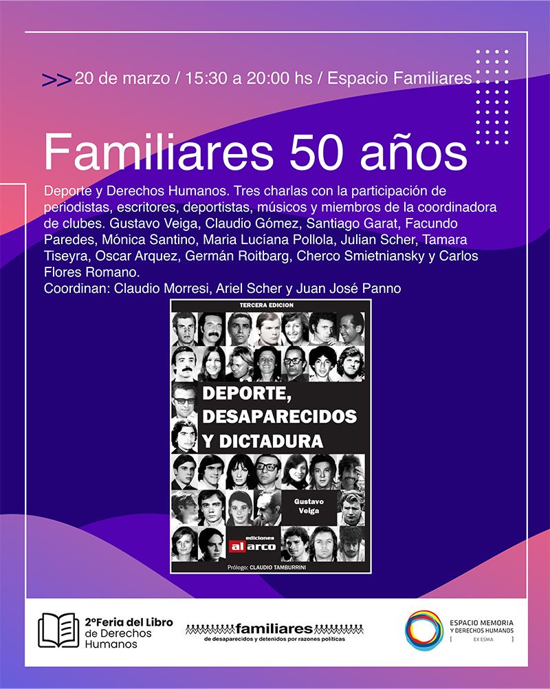 18.00. Deportes y DDHH. Participan: Pedro Pérez Di Salvo, deportista. Mónica Santino, entrenadora-periodista. Gustavo Veiga y Claudio Gómez, escritores. Coordina: Claudio Morresi.