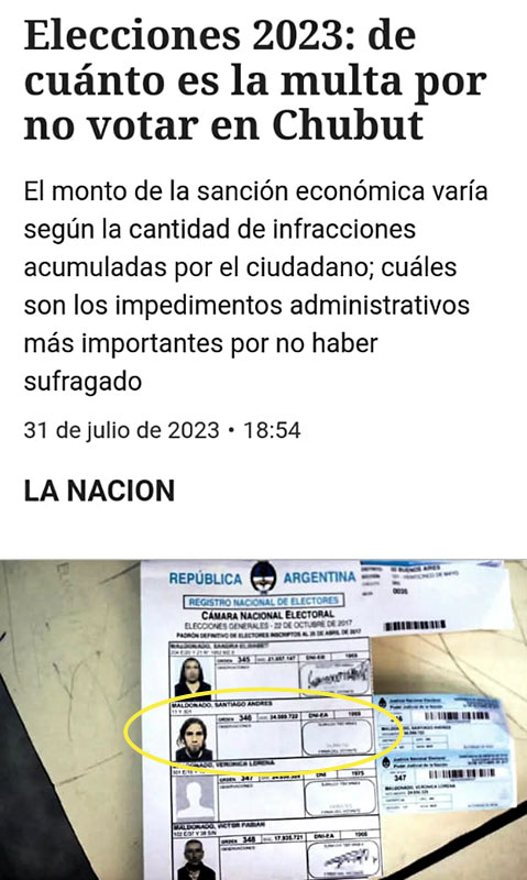Elecciones 2023: de cuánto es la multa por no votar en Chubut es el título de la nota que publicó el diario La Nación el lunes 31 de julio y que se conoció el 1 de agosto, el día que se cumplen seis años de la desaparición de Santiago Maldonado, justamente en esa provincia. En la nota enumeran el monto económico que deberán pagar los ciudadanos por no haber votado pero la ilustración lleva la foto del documento de identidad de Santiago.