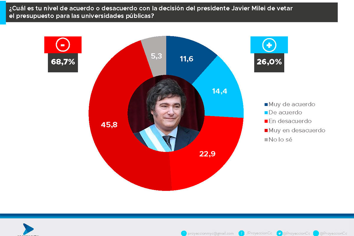 El 94,1% considera que la universidad pública es importante para el desarrollo del país, el 83,6% está de acuerdo con que el Estado las financie y promueva el acceso para toda la población, y el 68,7% rechaza la decisión del presidente Milei de «vetar el presupuesto para las universidades públicas».
