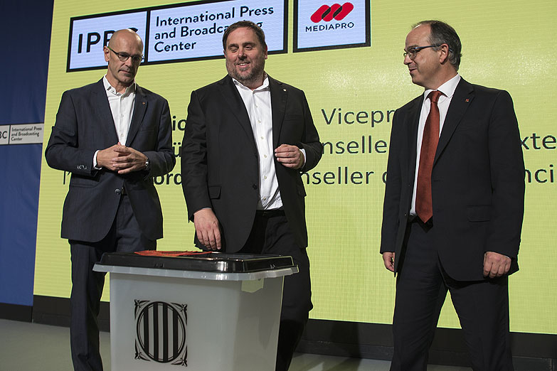 El vicepresidente de la Generalitat, Oriol Junqueras; el consejero de Presidencia, Jordi Turull, y el consejero de Asuntos Exteriores, Raül Romeva, presentaron las urnas en un acto en el International Press and Broadcasting Center habilitado en Barcelona para los medios españoles, catalanes e internacionales que cubrirán el referendo.