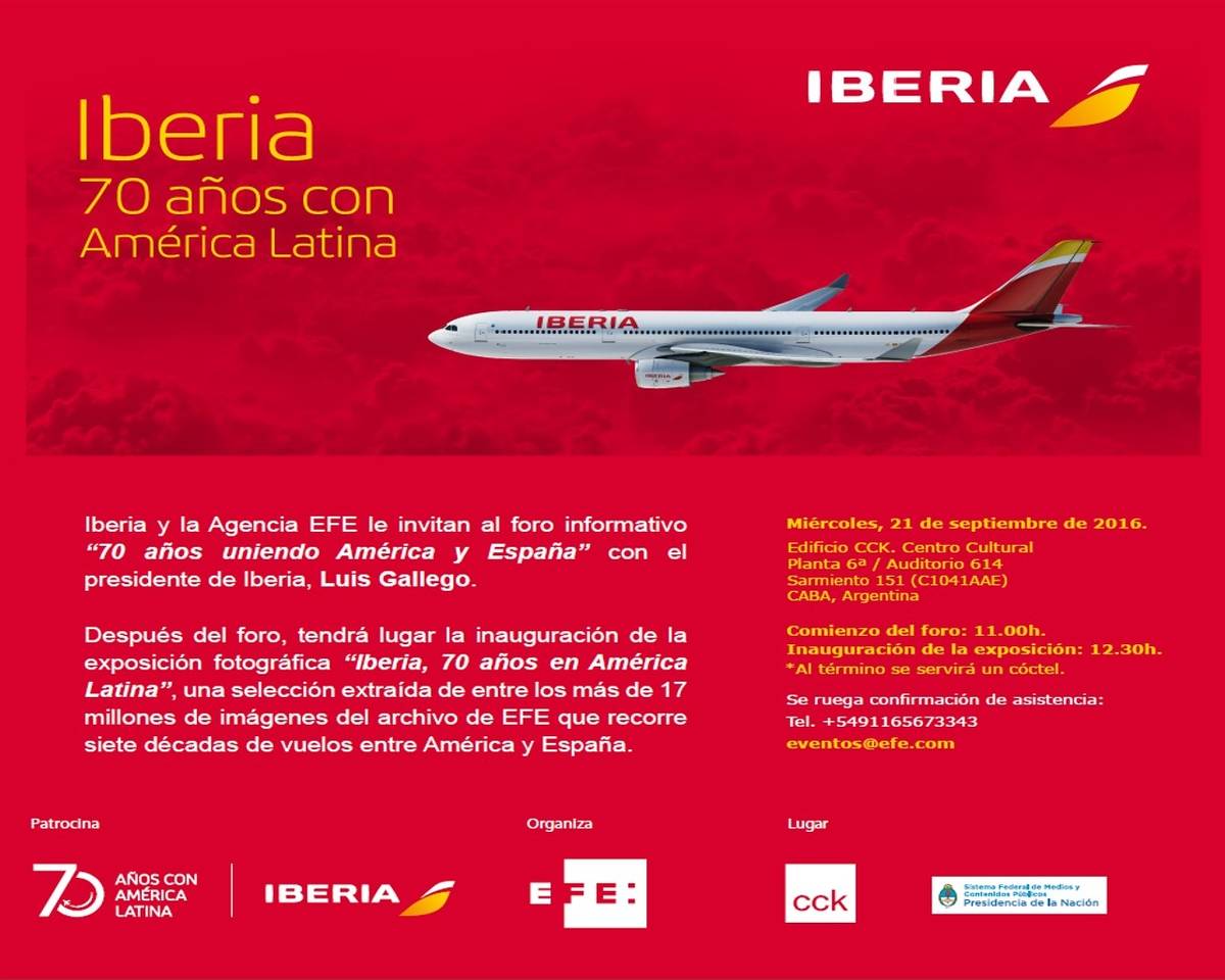 Por medio de un comunicado los organizadores anunciaron hoy que Iberia y la Agencia EFE invitan al foro informativo 70 años uniendo América y España con el presidente de Iberia Luis Gallego. La invitación añade que después del foro se realizará la exposición fotográfica Iberia, 70 años en América Latina.