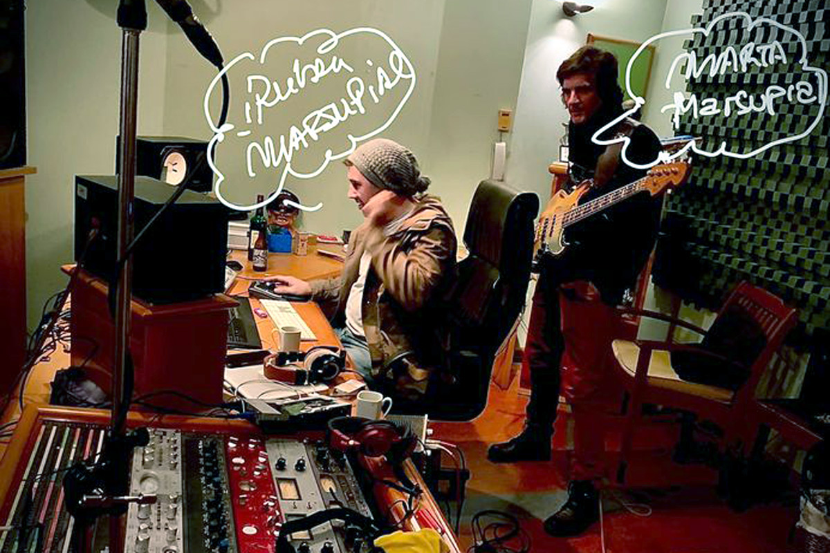 En las imágenes que el exlíder de Los Redondos compartió en las últimas horas puede verse, dentro de un estudio de grabación, a un bajista sobre el que aparece la leyenda “Marta marsupial” y a otro integrante monitoreando sonido en una computadora, señalado como “Ruben marsupial”.
